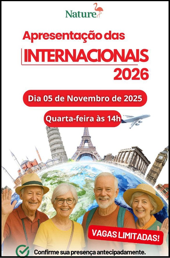 A agência Nature Viagens e Turismo, conveniada com a DS/Rio, convida os filiados e seus dependentes para o evento de divulgação das próximas viagens internacionais da empresa.